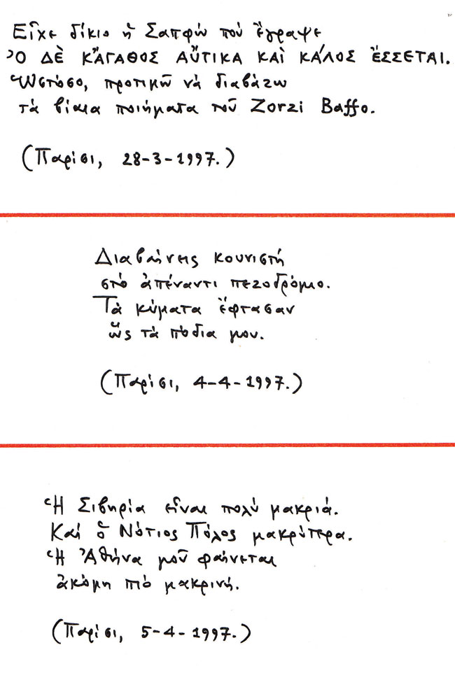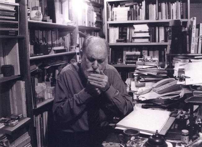 Την πρώτη μέρα συζητούσαμε για ώρες. Στο γραφείο του, ένα δωμάτιο όπου ακόμα και τα παράθυρα καλύπτονταν από ράφια με βιβλία, άπειρα μολύβια και μαρκαδοράκια. Τα κοίταζα με περιέργεια που τον ανάγκασε να μου πει: «Τα θαυμάζεις τα μολύβια μου, ε; Και ο Καρούζος το ίδιο έκανε αλλά πού και πού μου έπαιρνε και κανένα φεύγοντας».