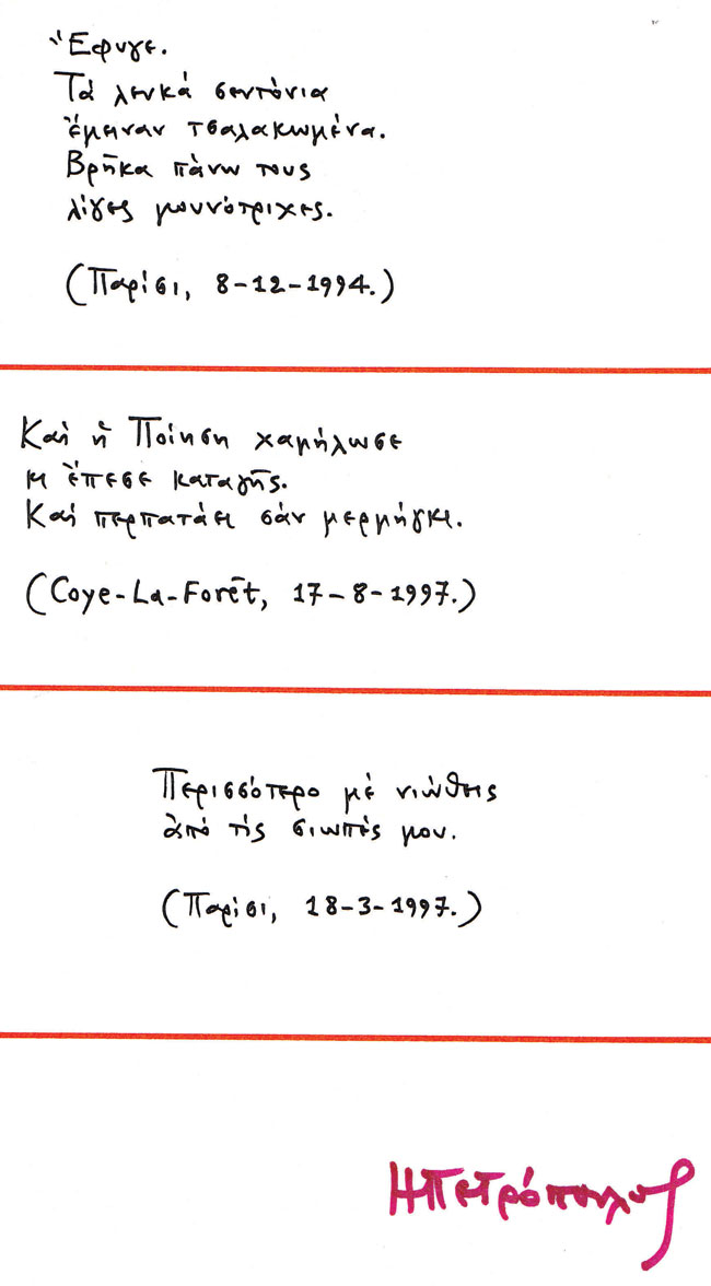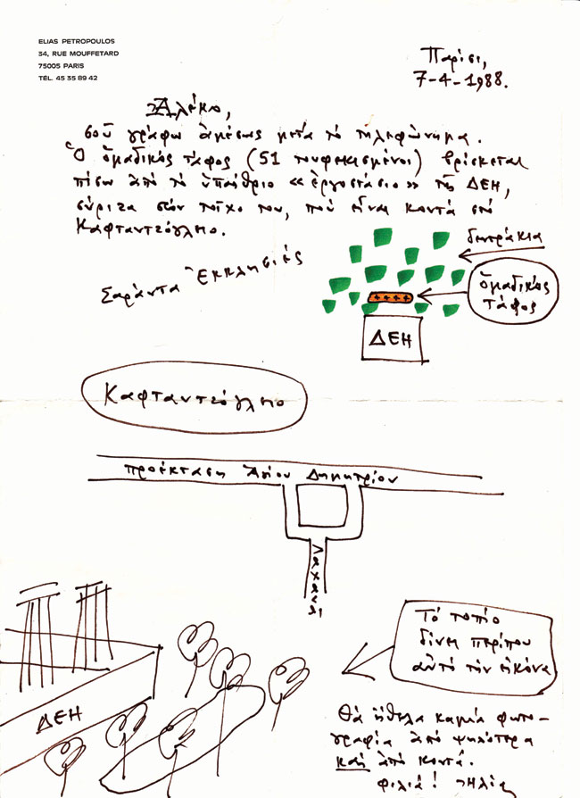 Με το θάνατο του Ηλία Πετρόπουλου λογικά θα έπρεπε να σταματήσει και η ταινία μου. Ξαφνικά βρίσκομαι να έχω την έγκριση του ίδιου, την έγκριση του Ελληνικού Κέντρου Κινηματογράφου, αλλά να μην έχω τον ίδιο πέραν των γυρισμάτων της πρώτης επίσκεψής μου στο Παρίσι. Ο ήρωας της ταινίας είναι απών πλέον. Η αρχική ιδέα που είχα στο μυαλό μου ήταν να τραβήξω πλάνα με τις ατέλειωτες συζητήσεις που συνήθιζε να κάνει. Φίλοι του έλεγαν ότι μπορούσαν να κάθονται και να μιλάνε για ώρες, όλη τη νύχτα ακόμα χωρίς ο ίδιος να κουράζεται. Είχα φανταστεί να βρεθώ σε μια τέτοια βραδιά και να την κινηματογραφήσω.