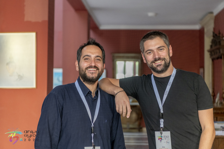Ο Άρης Καπλανίδης και ο Ηλίας Ρουμελιώτης, στο πλαίσιο της Αγοράς του Animasyros 2022, μας έδωσαν μία μικρή γεύση από το νέο τους πρότζεκτ που έχει τίτλο «Γυναίκες του ’22». Εικόνες δυνατές, γυναίκες μαυροφορεμένες και μη, σε διάφορες φάσεις της ζωής τους, σου φαίνονται οικείες κατά έναν παράξενο τρόπο ενώ οι φωνές και η χροιά τους καθώς περιγράφουν όσα έζησαν σου μένουν καρφωμένες στο μυαλό παράλληλα με την ιδιαίτερη μουσική επένδυση του. Τα παιδιά δεν χρειάζονται ιδιαίτερες συστάσεις μιας και οι περισσότεροι τους θυμούνται από το μικρού μήκους animation «Από το Μπαλκόνι» που έχει τιμηθεί με 20 βραβεία σε ελληνικά και διεθνή φεστιβάλ αλλά και από τις live action ταινίες, τα μουσικά βίντεο και τα διαφημιστικά που έχουν κάνει. Τους συνάντησα Σάββατο πρωί όχι στο «αρχηγείο» τους αλλά στην αυλή του Απόλλωνα για να μιλήσουμε για τις «Γυναίκες του ’22», το 80λεπτo ντοκιμαντέρ κινουμένων σχεδίων που αφορά αφηγήσεις γυναικών από τη Μικρασιατική Καταστροφή.