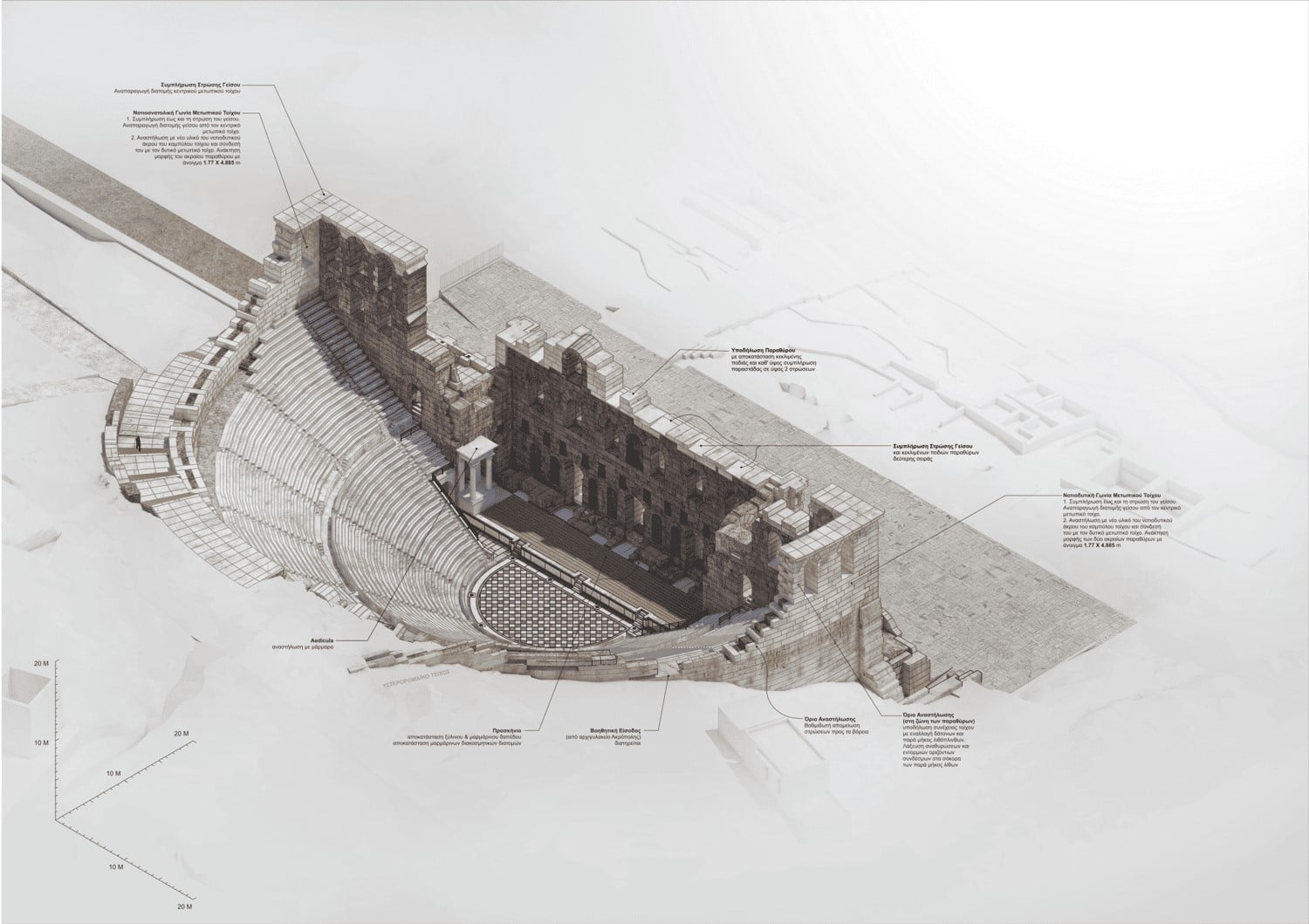 Το σύνολο των παρεμβάσεων βασίζεται στη διατήρηση των αυθεντικών στοιχείων, στις απολύτως αναγκαίες συμπληρώσεις και σε αναστρέψιμες λύσεις, με στόχο την ισορροπία ανάμεσα στη μνημειακή προστασία και στη σύγχρονη πολιτιστική λειτουργία ενός εμβληματικού χώρου θεάματος και ακροάματος.