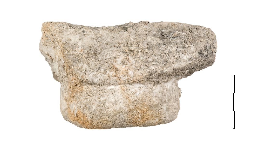 Το σημαντικότερο εύρημα της φετινής ανασκαφής είναι ένα μαρμάρινο διακοσμητικό στοιχείο. Πρόκειται για θραύσμα μαρμάρινης πλάκας με διακοσμητική σταγόνα, που πιθανότατα ανήκει είτε σε κανόνα επιστυλίου είτε σε πρόμοχθο γείσου.