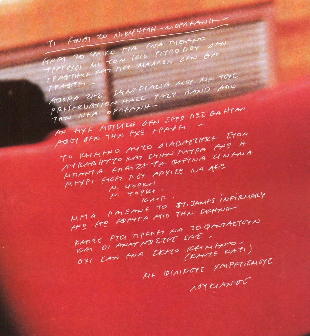 Είναι το υλικό για ένα πιθανό τραγούδι με τον ίδιο τίτλο που δεν γράφτηκε και που μάλλον δεν θα γραφτεί. Αφορά τη συνεργασία μου με τους Preservation Hall Jazz Band από τη Νέα Ορλεάνη. Αν είχε μουσική δεν ξέρω πώς θα ήταν αφού δεν την έχω γράψει. Το κείμενο αυτό διαβάστηκε στον Λυκαβηττό και στην Πάτρα ενώ η μπάντα έπαιζε τα Θερινά Σινεμά μέχρι εκεί που αρχίζω να λέω