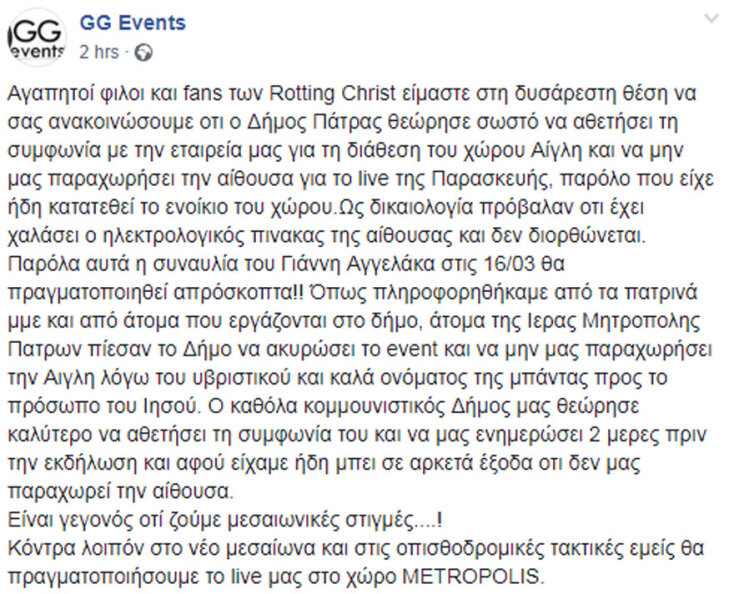 Σάλος στην Πάτρα μετά την ακύρωση της συναυλίας - της πρώτης από την περιοδεία - των Rotting Christ στην δημοτική αίθουσα της Αίγλης στη Veso Mare της Πάτρας.