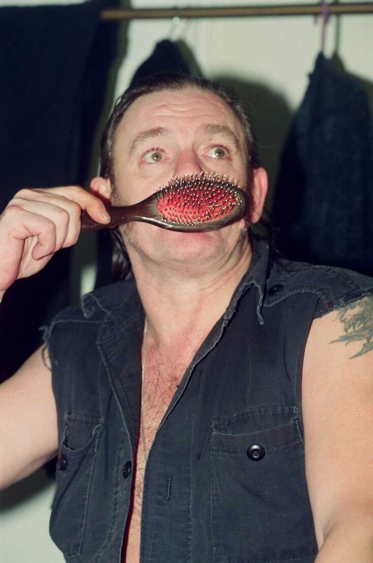Και έρχεται η ώρα για τις ομαδικές. Αφού ψάχνονται λιγάκι για το τι θα κάνουν, πού θα σταθούν, ο οπλαρχηγός κάθεται στην καρέκλα και καλεί τους άλλους δυο πιο κοντά του. Τρία-τέσσερα κλικ σε νορμάλ φάση. Όμως είχε κι άλλο ο μπαξές για μένα κείνο το βράδυ. Σε κέφια ο Campbell, μου λέει «δώσε μου μισό λεπτό αν θες», και τι κάνει; Βγάζει τα μποτάκια του, τα βάζει στο πάτωμα και γονατίζει πάνω τους, έτσι ώστε να μοιάζει με νάνο!!! Όσο για τον Lemmy… «Κάτσε» μου λέει, «θα κάνω ότι μου δίνω μια μπουνιά!». Οκέι. Σκάω στα γέλια. Πρέπει να ήμουν κόκκινος σα παντζάρι πλέον. Γαζώνω. Θυμίσω, βρισκόμαστε στην εποχή των films ακόμη και τα υπερευαίσθητα (high ISO) κόστιζαν αρκετά. Ε, και; Εσύ δεν θα γάζωνες στη θέση μου; Δώσε κι άλλο μπάρμπα!