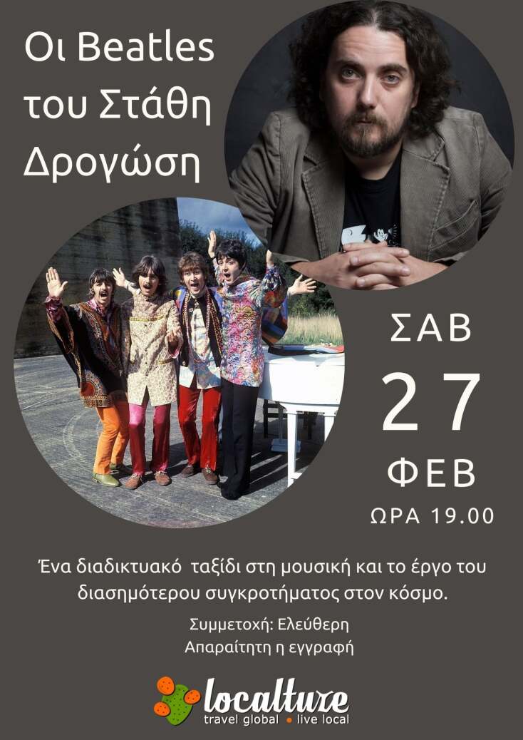 Σε αυτή την ανοιχτή συζήτηση, στην οποία η συμμετοχή είναι δωρεάν αλλά είναι απαραίτητη η εγγραφή (θα τηρηθεί σειρά προτεραιότητας), ο Στάθης Δρογώσης πρόκειται να παρουσιάσει με τη μουσική του παιδεία και την κριτική του ματιά την one of a kind πορεία των Beatles προς την αιώνια δόξα: η ρήξη με το κατεστημένο, οι αγώνες για τα ανθρώπινα δικαιώματα, οι επιτυχίες, οι απογοητεύσεις, οι συγκρούσεις, οι τραγωδίες, οι πλέον δύσκολες στιγμές, οι ανταγωνισμοί, η αιώνια σύγκριση με τους Rolling Stones και το αναπάντεχο τέλος τους θα συζητηθούν με τη συμμετοχή του κοινού. Κυρίως όμως θα αναδειχθεί μέσα από την ανάλυση συγκεκριμένων τραγουδιών τους η ξέφρενη συνθετική τους πορεία. Πώς από τον Buddy Holly έφτασαν στην ψυχεδέλεια και στο συμφωνικό rock. Και πώς ξαναγύρισαν στις ρίζες τους -κι όλα αυτά- μέσα σε επτά χρόνια επίσημης δισκογραφίας.