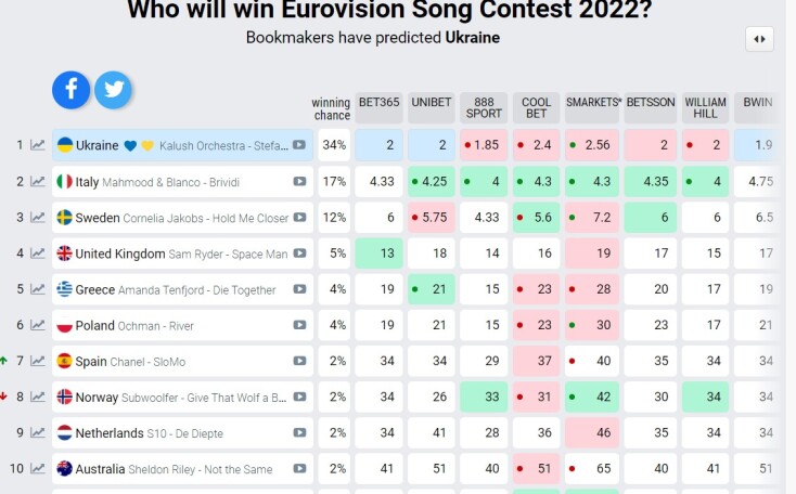 Eurovision 2022: Ποια η θέση της Ελλάδας στα στοιχήματα - Η πρώτη 10άδα