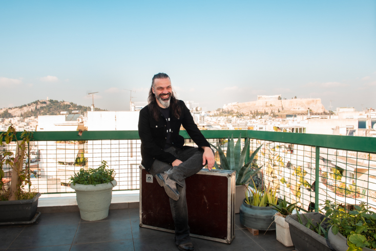 Ο κιθαρίστας, συνθέτης και μουσικός παραγωγός μας υποδέχεται στο ρετιρέ που μεταμόρφωσε στον Νέο Κόσμο