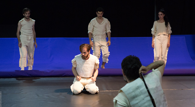 Η παράσταση. Λίγο μετά τις 9 το βράδυ, οι ηθοποιοί −ανάμεσά τους και ο σκηνοθέτης− πλησιάζουν κουβαλώντας στους ώμους ένα τεράστιο μπλε μοβ τόπι −το σκηνικό της παράστασης− το οποίο σπάει στα τρία, ξετυλίγεται και καλύπτει την άδεια ορχήστρα του θεάτρου.