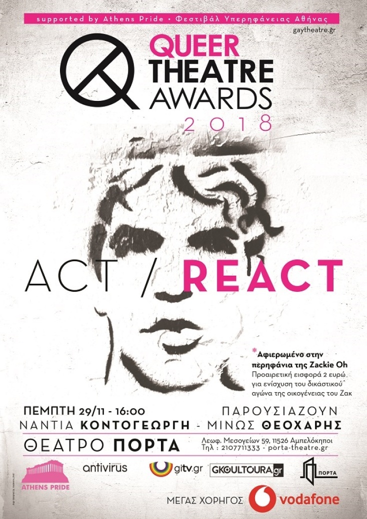 Επτά χρόνια ζωής για έναν θεσμό που ξεκίνησε δειλά αλλά καθόλου φοβισμένα, επιχειρώντας να δώσει προβολέα σε όσους/όσες και όσες ομάδες δήλωσαν παρουσία, διαφορετικότητα και τέχνη. Τα Queer Theatre Awards είναι τα περήφανα θεατρικά βραβεία που οργανώνονται με την υποστήριξη του Φεστιβάλ Υπερηφάνειας Αθήνας Athens Pride και γιορτάζουν την ορατότητα της queer θεματολογίας και της διαφορετικότητας στο θέατρο. Η φετινή διοργάνωση, στο τέλος μίας άγριας, δύσκολης και απαιτητικής για όλους χρονιάς, είναι αφιερωμένη στην περηφάνια της Zackie Oh, του Ζακ Κωστόπουλου.