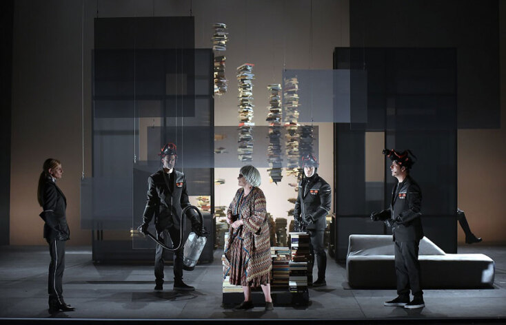 Η σκηνοθεσία του Θωμά Μοσχόπουλου αναδεικνύει μοναδικά την εύθραυστη αυτή ευδαιμονία, τον άρρηκτο δεσμό του σαγηνευτικού κόσμου του θεάματος με την αλλοτρίωση των ανθρώπων, τη θεοποίηση της ταχύτητας και της μαζικής κουλτούρας. Το μίνιμαλ σκηνικό, δια χειρός Ευαγγελίας Θεριανού, με τις διαφορετικού μεγέθους κατασκευές που αναπαριστούν τους τηλετοίχους και τις οθόνες προβολής, δημιουργεί την αίσθηση της επίπλαστης ασφάλειας και του ελεγχόμενου περιβάλλοντος. Όταν δε αποκαλύπτεται το βάθος της σκηνής, με τον εσωτερικό φωτισμό και τις στοίβες των βιβλίων, ο θεατής μένει εκστατικός με τον συμβολισμό που εξυπηρετεί αυτή η αλλαγή: είναι το εσωτερικό του σπιτιού της ηλικιωμένης που αρνείται να εγκαταλείψει τα βιβλία της αλλά και εκείνο της αρχηγού που τα σιχαίνεται όσο τίποτε άλλο στη ζωή της. Αγάπη και μίσος σε αντιπαραβολή με το ίδιο φόντο. Οι λιτές γραμμές και οι έντονες αντιθέσεις, σε χρώματα και υφάσματα, των κουστουμιών της Κλαιρ Μπρέισγουελ δένουν αρμονικά με τις εναλλαγές των φωτισμών, που επιμελείται η Σοφία Αλεξιάδου, και την εντυπωσιακή μουσική υπόκρουση του Κορνήλιου Σελαμσή.