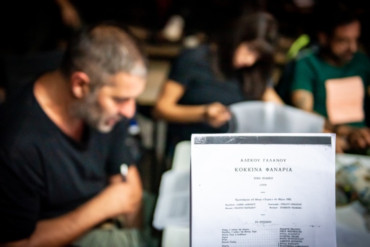 Οι πρωταγωνιστές αυτών των «Κόκκινων Φαναριών» κάθονται σε έναν ξεχειλωμένο κύκλο που έχουν σχηματίσει από πέντε τετράγωνα τραπέζια. Διαβάζουν ένας-ένας τις ατάκες του Αλέκου Γαλανού, ανάλογα με τους ρόλους που τους έχουν μοιραστεί. Οι εντάσεις, τα ηχοχρώματα και η εκφορά του λόγου εναλλάσσονται με τρόπο τέτοιο που μπορείς να ακούσεις τις ιστορίες διαφορετικών ανθρώπων να γίνονται ένα μέσα από την πολυφωνία. «Τη φρασεολογία θα πρέπει να τη δούμε», λέει ο Βασίλης και ζητάει τη βοήθεια του Παπάζογλου για να εντάξει καλιαρντά στο κείμενο της παράστασης. «Υπάρχουν κι άλλα θέματα που θα προκύψουν και πρέπει να δούμε. Οι τραβεστί που θέλουν να υιοθετήσουν παιδί. Πώς θα το κάνουμε; Μπορεί να μη συμβαίνει, αλλά θα γίνει κάποια στιγμή. Ίσως πρέπει να θέσουμε ένα τέτοιο θέμα», σκέφτεται φωναχτά ο Μπισμπίκης και ζητάει τη γνώμη της ομάδας του.