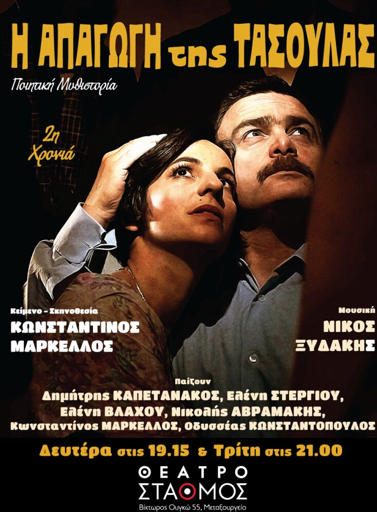 «Η Απαγωγή της Τασούλας»! Μπορεί ο τίτλος να παραπέμπει σε κάτι οικεία παλιό και όντως αυτό συμβαίνει, αλλά μόνο ως προς το πρώτο σκέλος. Το έργο είναι οικείο αλλά εντελώς νέο! Ας πάρουμε τα πράγματα από την αρχή. Ήδη από την περασμένη σεζόν το πρωτότυπο έργο του Κωνσταντίνου Μάρκελλου εντυπωσίασε όσους το είδαν και οι λόγοι ήταν πολλοί. Σπάνια ποιητικότητα, λυρισμός, καταιγιστική δράση, και όλα αυτά με υπόκρουση την εξαιρετική, πρωτότυπη μουσική του καταξιωμένου συνθέτη Νίκου Ξυδάκη.