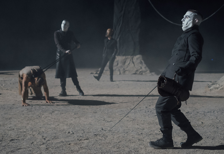 Τρεις μαύροι, τεράστιοι, αλύγιστοι, σκληροί και αφιλόξενοι πέτρινοι στύλοι, είναι το σκηνικό, η «κατοικία» του αλυσοδομένου Προμηθέα (Γιάννης Στάνκογλου), που θα φτάσει σε λίγο εκεί, για να δεθεί πάνω στον έναν από αυτούς από τον απελπισμένο γι' αυτό που διατάχτηκε να κάνει Ήφαιστο (Δαυίδ Μαλτέζε). Εκεί επέλεξε ο Δίας (η απόλυτη και ανάλγητη εξουσία θεών και ανθρώπων) να τιμωρήσει ανελέητα έναν άνθρωπο («τον σοφό τον ανόητο») που ήθελε να προσφέρει στους ανθρώπους τα μέσα για να προοδεύσουν, να δημιουργήσουν, να «κάνουν τέχνη τη ζωή».