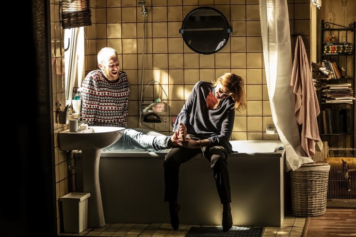 Μπαίνοντας στον Χώρο Η, αφού πρώτα ελέγχθηκαν τα πιστοποιητικά εμβολιασμού, είδαμε στη σκηνή το προστατευτικό κέλυφος ενός σύγχρονου διαμερίσματος. Χωρίς ιδιαίτερα χαρακτηριστικά. Ουδέτερο, λευκό, μ' ένα παράθυρο σφαλιστό και μια πόρτα να μας επιτρέπει να κρυφοκοιτάμε στο εσωτερικό του. Εκεί όπου βρίσκεται μια ετοιμόγεννη γυναίκα, η Μάγια, και ο άντρας της, ο Λαρς, ένας Νορβηγός που μιλάει πολωνικά με νορβηγική προφορά. Και ξαφνικά η θεατρική σκηνή γίνεται κινηματογραφική οθόνη και παρακολουθούμε το ζευγάρι στο εσωτερικό του σπιτιού, με τη μαία που βοηθάει στη γέννα. Βλέπουμε, επί σκηνής και επί οθόνης, την αγωνία της γυναίκας, το φόβο, τη σχέση που δημιουργείται με τη μαία, την οδύνη, τέλος, όταν το παιδί γεννιέται για να πεθάνει λίγα λεπτά μετά. Ο Κόρνελ Μούντρουτσο εγκλωβίζει τον θεατή στις εκφράσεις, στα συναισθήματα, στις παραμικρές λεπτομέρειες των μυών. Τον κάνει να νιώθει πως βρίσκεται κι εκείνος μέσα σ' εκείνο το σπίτι.