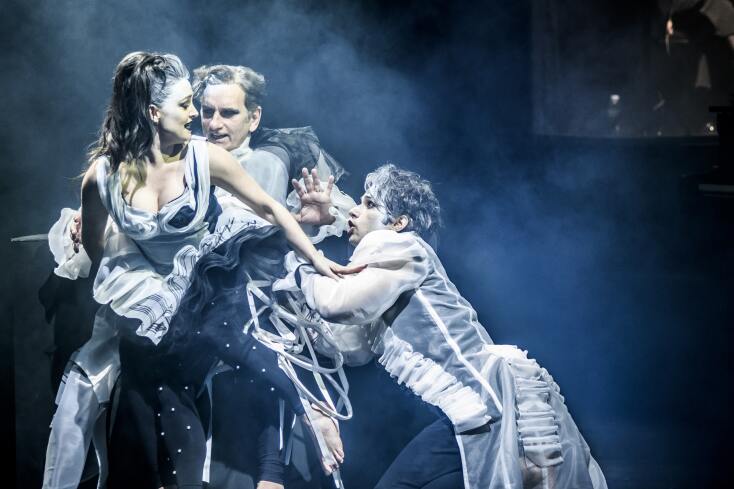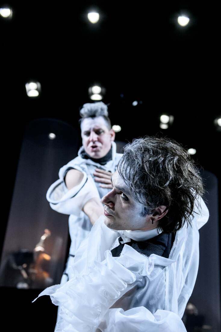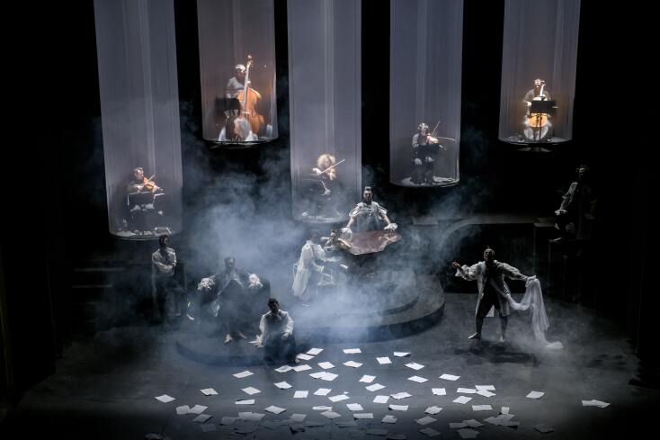 Το σκηνικό (Όλγα Μπρούμα, που έκανε πάλι τα μαγικά της) είναι εντυπωσιακό και αφαιρετικό μαζί, με διάφορα επίπεδα, ανοίγματα και κρυφά περάσματα (ρεαλιστικά και συμβολικά) και με τους μουσικούς -τη μουσική- να στέκεται ψηλά, πάνω απ’ όλα, σαν μέσα σε κυλίνδρους, που ταξιδεύει στο χρόνο -σκέφτομαι- και φτάνει πάντα, παντού. Τα κοστούμια παραπέμπουν στην εποχή με μια παιγνιώδη όμως διάθεση, αυτήν ακριβώς που έχει (που παραέχει θα έλεγα) όλο το ύφος της παράστασης, που σε αρκετές στιγμές παραπέμπει στο είδος της φάρσας, σκηνοθετική επιλογή την οποία δυσκολεύτηκα να αντιληφθώ.