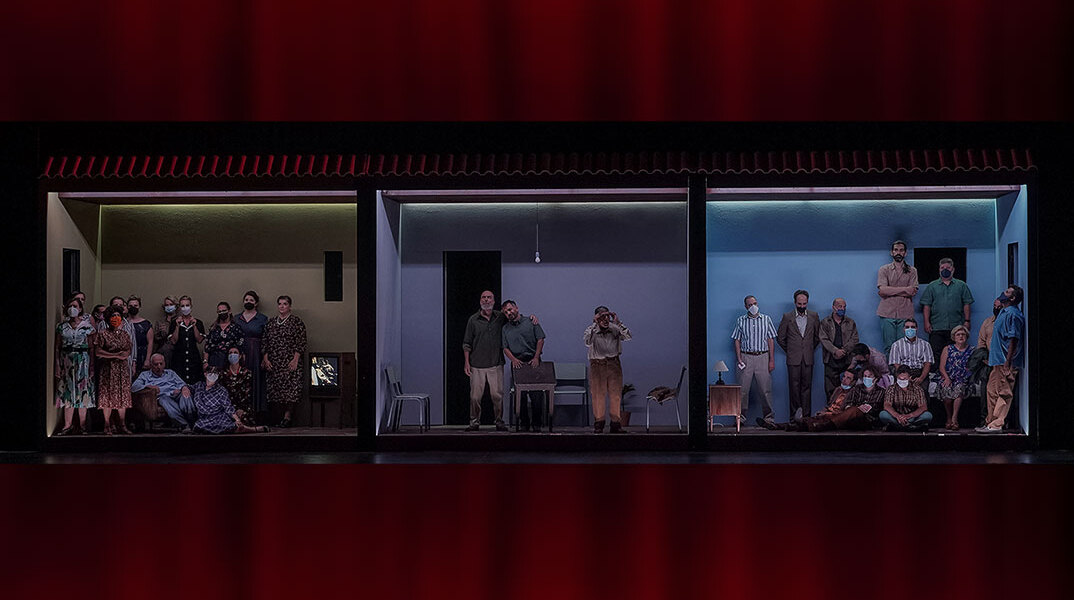 Α.Τ. Καταρχάς δεν ξέραμε αν θα ξαναγίνει. Και επειδή η στεναχώρια μου ήταν μεγάλη ειδικά τους πρώτους μήνες από την ακύρωση, το απώθησα από το μυαλό μου, για έναν χρόνο μπορεί να μην είδα καν την παρτιτούρα. Μόνο όταν μας ανακοίνωσαν ότι τελικά θα ανέβει, την ξανάπιασα, αναθεώρησα ορισμένα πράγματα, συζητήσαμε με τον Νίκο τις αλλαγές που κρίναμε απαραίτητες... Να σας πω κάτι χαρακτηριστικό. Σε μια σκηνή, εμπνευσμένη από το αρχικό φαινόμενο, της Ιαπωνίας, πεθαίνει ένας ηλικιωμένος και μπαίνει ένα συνεργείο να καθαρίσει το σπίτι. Στις πρώτες πρόβες, τους είχαμε βάλει να φορούν κάποιες άσπρες στολές που είχαμε βρει στο βεστιάριο της Λυρικής. Και μετά, επί δύο χρόνια αρχίσαμε να βλέπουμε παντού άσπρες στολές. Πώς γινόταν, σκεφτήκαμε, κάτι που το 2020 δεν σήμαινε κάτι ιδιαίτερο, το 2022 να σημαίνει τόσα πολλά για όλους; Ήταν τρομακτικό! Με έναν τρόπο, αυτά τα δύο χρόνια παύσης μπορεί να ήταν και για καλό.