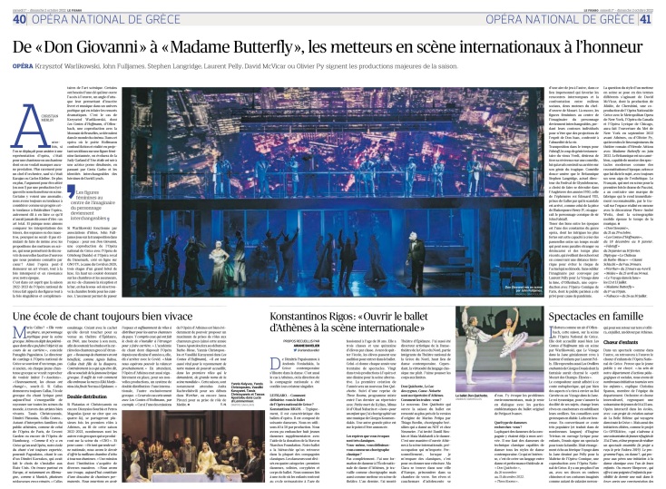 Στο ρεπορτάζ του με τίτλο «Από τον Ντον Τζοβάννι ως τη Μαντάμα Μπαττερφλάι οι διεθνείς σκηνοθέτες έχουν την τιμητική τους», ο Christian Merlin αναφέρεται στις μεγάλες παραγωγές όπερας της σεζόν 22/23 της ΕΛΣ που θα σκηνοθετήσουν οι Κρύστοφ Βαρλικόφσκι (Τα παραμύθια του Χόφμαν), Τζων Φούλτζεϊμς (Ντον Τζοβάννι), Στήβεν Λάνγκριτζ (Φάλσταφ), Λωράν Πελλύ (Το ταξίδι στη Σελήνη), Ντέιβιντ ΜακΒίκαρ (Μήδεια) και Ολιβιέ Πυ (Μαντάμα Μπαττερφλάι) και αναλύει τις σκηνοθετικές τους προσεγγίσεις.