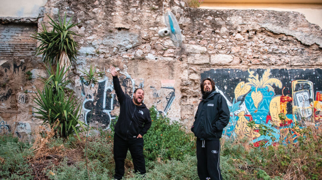 Έφθασαν στο ραντεβού μας στον Κεραμεικό φουριόζοι και γελαστοί, μετά το πρώτο πέρασμα της παράστασης στην πρόβα. Κι εκεί που μιλούσαμε με τον Γιάννη Νιάρρο και τον Αλέξανδρο Λιβιτσάνο για το «Σπιρτόκουτο» –το οποίο μεταμορφώνουν σε μιούζικαλ για τη Στέγη μετά από πρόταση του ίδιου του δημιουργού του Γιάννη Οικονομίδη–, η πραγματικότητα της θρυλικής ταινίας αλλά και της δικής τους παράστασης έσκασε σαν αναπάντεχο χαστούκι με το πέρασμα ενός αυτοκινήτου που τα ηχεία του αντηχούσαν σε ρυθμό τραπ «γιατί είσαι κ@ριόλ@»…