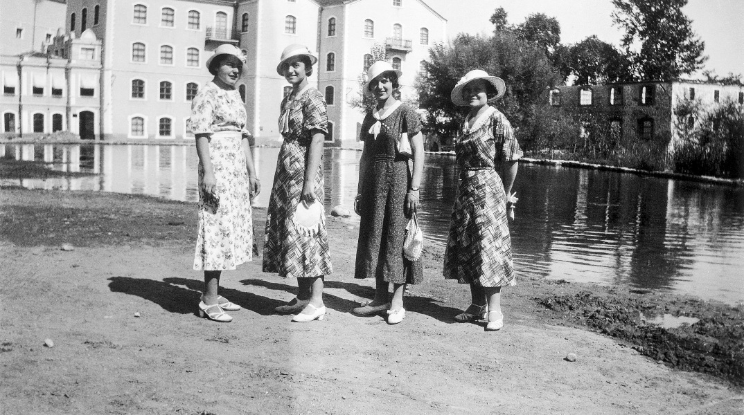 Πηγές Αγίας Βαρβάρας μπροστά στις καπναποθήκες του Herman Spierer και του Γιοσέφ Φαρατζή. Διακρίνονται τα ταξί της εποχής που πλένονται. (Αρχείο Αθανάσιου Κάζη)