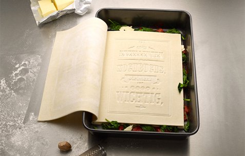 Είναι γερμανικός τσελεμεντές, κυκλοφορεί από τις εκδόσεις Korefe και είναι ο ορισμός του αναλώσιμου βιβλίου. Εν μέρει βιβλίο, εν μέρει λαζάνια. Οι σελίδες του είναι φύλλα ζυμαρικών. Αφού το διαβάσεις, λοιπόν, μπορείς να το μαγειρέψεις, μαζί με κρέας και λαχανικά και να το σερβίρεις.