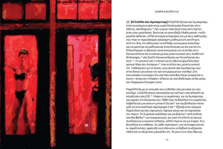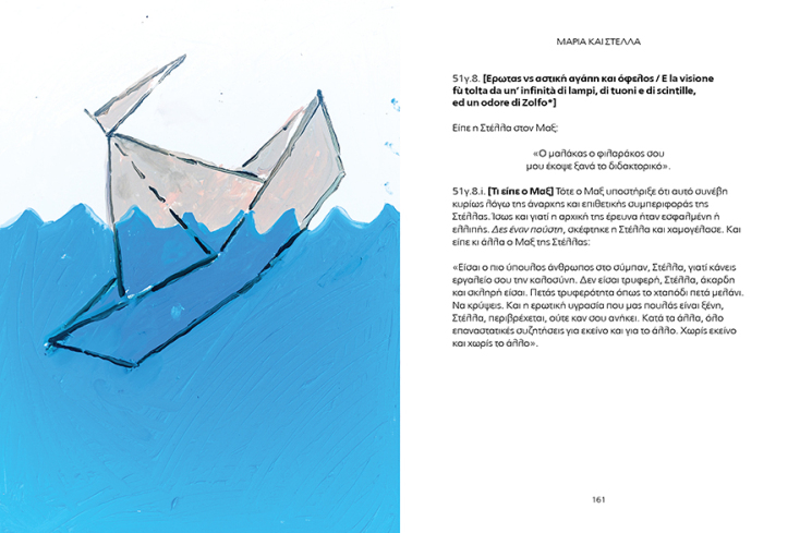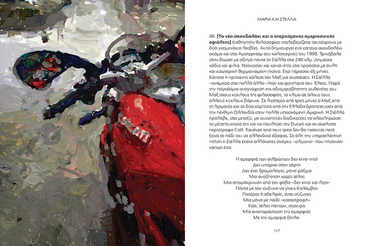 Το βιβλίο το έγραψα στην Κρήτη και ανέβηκα στην Αθήνα για να βρω εκδότη και μέσα σε μια εβδομάδα δώσαμε τα χέρια με τον Φώτη Γεωργελέ. Δεν μου έχει ξανασυμβεί αυτό. Είναι ένα βιβλίο που εγώ δεν έχω ξαναδεί παρόμοιό του. Ίσως αυτό είναι και το μεγαλύτερο πλεονέκτημά του. Δεν είναι κόμικς, δεν είναι κλασικό graphic novel, δεν είναι ένα εικονογραφημένο βιβλίο, είναι ένα παράξενο πράγμα. Καταρχήν είναι ένα πάρα πολύ ωραίο αντικείμενο, έτσι όπως το σχεδιάσαμε με τον Γεωργελέ. Η ιδέα είναι ότι έχουμε μία ιστορία την οποία αφηγούμαστε θραυσματικά – αυτό το εμπνεύστηκα, για παράδειγμα, από τη Γυναίκα της Ζάκυθος του Σολωμού, από το Logico-Philosophicus του Βιτγκενστάιν που λέει 1. τάδε, 2. τάδε, σπαράγματα δηλαδή. Δεν υπάρχει μια συνοχή. Βέβαια, με πονηριά, όλα αυτά τα έχω βάλει με μία σειρά ώστε το βιβλίο να βγάζει νόημα – μη τρελαθούμε!