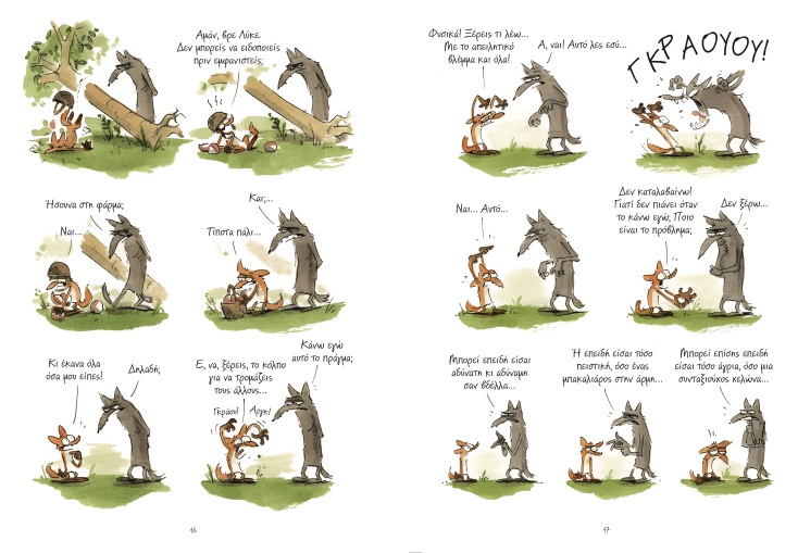 Δεν θα αποκαλύψουμε περισσότερα — απλώς να προσθέσουμε ότι οι ανατροπές είναι απανωτές, και το τέλος απλά υπέροχο. Διαβάστε αυτό το βιβλίο μαζί με τα παιδιά σας. Θα περάσετε καλά και εσείς, και εκείνα. Συζητήστε μαζί τους τις συμβουλές του Λύκου, την αντίδραση των ζώων της φάρμας, τις ιδέες της Αλεπούς, και δείτε πού κάνει λάθος (hint: παντού). Θα ανακαλύψετε πάμπολλα πράγματα για να σχολιάσετε, αλλά κυρίως διαβάζοντας θα γελάσετε πολύ.