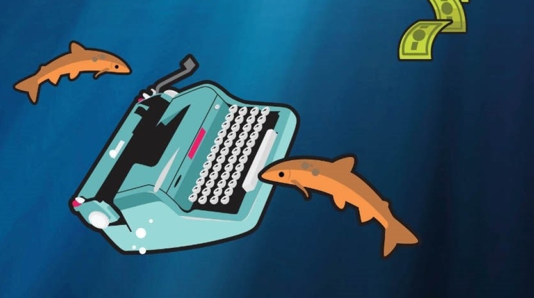 Ένα ροζ background, πλαισιώνει μια γαλάζια γραφομηχανή, που φαίνεται να «καταπίνει» σαν να δέχεται στα «σπλάχνα της» ένα ψάρι -προφανώς σολωμό- που «βουτάει» μέσα της το κεφάλι του αφού είναι εξαφανισμένο -και φαίνεται μόνο το μισό και η ουρά του σολωμού- στο σημείο που θα έπρεπε να φιλοξενούνται λευκές ή δακτυλογραφημένες σελίδες.