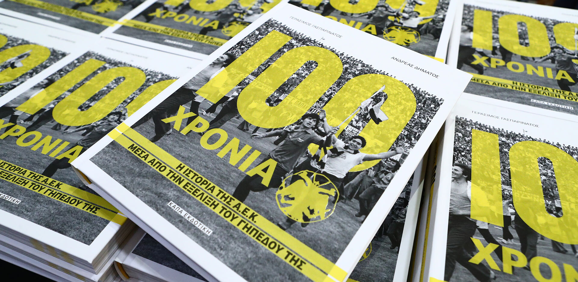 100 χρόνια μετά ο Γεράσιμος Γασπαρινάτος και ο Ανδρέας Δημάτος καταγράφουν τη διαδρομή του κιτρινόμαυρου οργανισμού σε συνάρτηση με την ιστορία του γηπέδου του και μέσα από το πρίσμα της εξέλιξής του στο βιβλίο «100 χρόνια ΑΕΚ: Η ιστορία της ΑΕΚ μέσα από την εξέλιξη του γηπέδου της», που κυκλοφορεί από την Κάπα Εκδοτική.