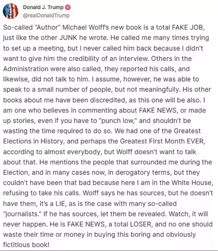 Αφού χαρακτήρισε το βιβλίο «FAKE JOB» και απέρριψε τον Γουλφ ως αναξιόπιστο, λέγοντας ότι δεν του απάντησε ποτέ στα αιτήματα για συνέντευξη γιατί δεν ήθελε να του δώσει «την αξιοπιστία μιας συνέντευξης». Επέμεινε ότι το βιβλίο, όπως και τα προηγούμενα του Γουλφ, θα «απορριφθεί» επειδή είναι «fake news» και ότι ο συγγραφέας δεν έχει πραγματικές πηγές. Επίσης, ισχυρίστηκε πως είχε «μία από τις μεγαλύτερες εκλογές στην ιστορία» και «ίσως τον καλύτερο πρώτο μήνα προεδρίας ποτέ». Κατέληξε, λέγοντας ότι ο Γουλφ είναι «FAKE NEWS», «ένας απόλυτος LOSER» και υπογράμμισε ότι κανείς δεν πρέπει να σπαταλήσει χρήματα αγοράζοντας το βιβλίο, το οποίο είναι «βαρετό και προφανώς πλασματικό».