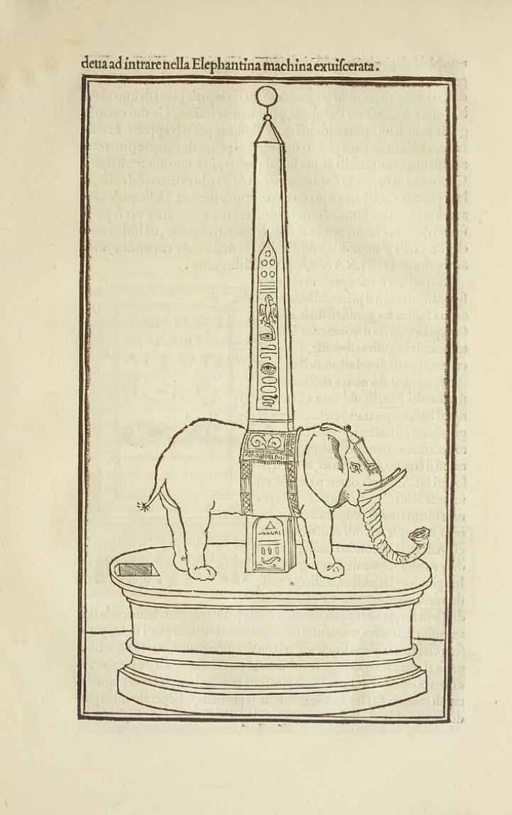 Από τη δεκαετία του 1630, ο Μπερνίνι επεξεργαζόταν σχέδια για ένα μνημείο εμπνευσμένο από μιαν εικόνα πιθανώς βγαλμένη από την «Υπνερωτομαχία του Πολυφίλου» (Hypnerotomachia Poliphili, ubi humana omnia non nisi somnium esse docet. Atque obiter plurima scitu sane quam digna commemorate, 1499), ένα κάπως απόκρυφο βιβλίο που από μιαν ακροστιχίδα της αποδίδεται στον Δομινικανό μοναχό Francesco Collona, σε έκδοση του θρυλικού Βενετού τυπογράφου Aldus Manutius· την Υπνερωτομαχία την είχαμε ακούσει σε έναν διάλογο του Dean Corso με κάτι φιλάργυρους κληρονόμους ενός συλλέκτη παλαιτύπων στην αρχή της «Ένατης Πύλης» (The Ninth Gate, 1999, σκηνοθεσία Roman Polanski), και έχει αποκληθεί «the most beautiful book ever printed».