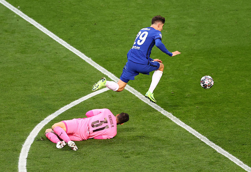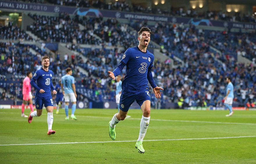 Στο 42' ο Χάβερτς έβαλε «φωτιά» στο γήπεδο «Ντραγκάο», ανοίγοντας το σκορ στον μεγάλο τελικό του Champions League 2021. Εκμεταλλευόμενος το μεγάλο κενό στο κέντρο, και παίρνοντας απίθανη μπαλιά-τρύπα από τον Μάουντ, o Χάβερτς πέρασε και τον Έντερσον και πλάσαρε σε κενή εστία, κάνοντας το 1-0 για την Τσέλσι. Πέντε λεπτά νωρίτερα, στο 37', οι Λονδρέζοι είχαν προειδοποιήσει με αντεπίθεση - φωτιά. Ο Καντέ μοίρασε στον Χάβερτς που κινήθηκε ωραία στην περιοχή, ωστόσο ο Ζιντσένκο τον έκοψε την τελευταία στιγμή.