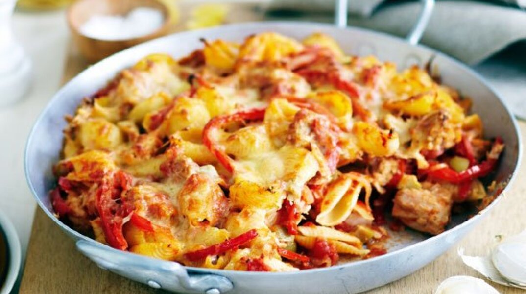 Τα ζυμαρικά κάνουν ωραίο ταίρι με τον τόνο, η πιπεριά δίνει χρώμα και γεύση, το σκόρδο ωραία αρώματα και από πάνω λιώνουν με όλη τους τη χάρη τριμμένη παρμεζάνα και μοτσαρέλα. Σε 40 λεπτά οι μυρωδιές θα τους έχουν μαζέψει όλους γύρω από το τραπέζι.