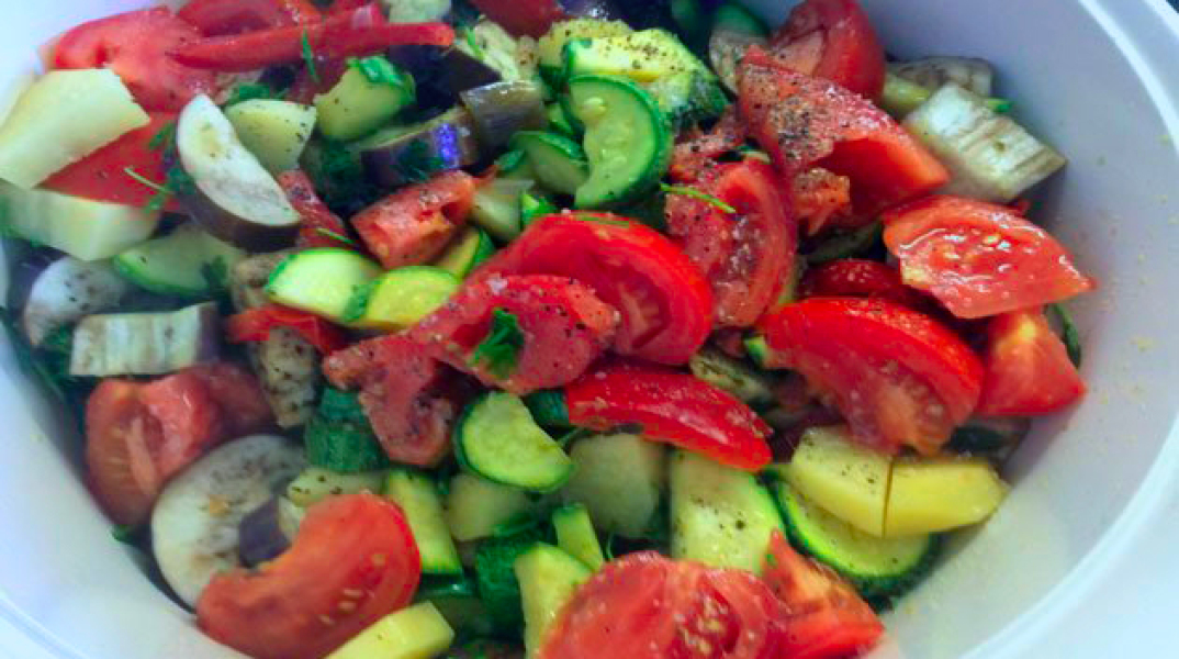 - Τα κόβουμε όλα σε κομμάτια, τα βάζουμε σε ένα ταψί βαθύ, αφού τα ανακατέψουμε με τα χέρια, για να λαδωθούν και να αλατοπιπερωθούν παντού.