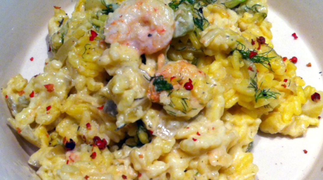 - Το στάδιο αυτό θα διαρκέσει περίπου είκοσι λεπτά, το ρύζι πρέπει να κρατάει στο κέντρο και να χυλώνει εξωτερικά, κι εσείς να κρατάτε σταθερό το επίπεδο των υγρών προσθέτοντας αναλόγως. Στο τέλος βάζετε τις αχνισμένες γαρίδες με τα υγρά τους. Προσθέτετε δυο τρεις κουταλιές τριμμένη παρμεζάνα, την κρέμα, κι από πάνω ψιλοκομμένες τις τουφίτσες του φινόκιο.
