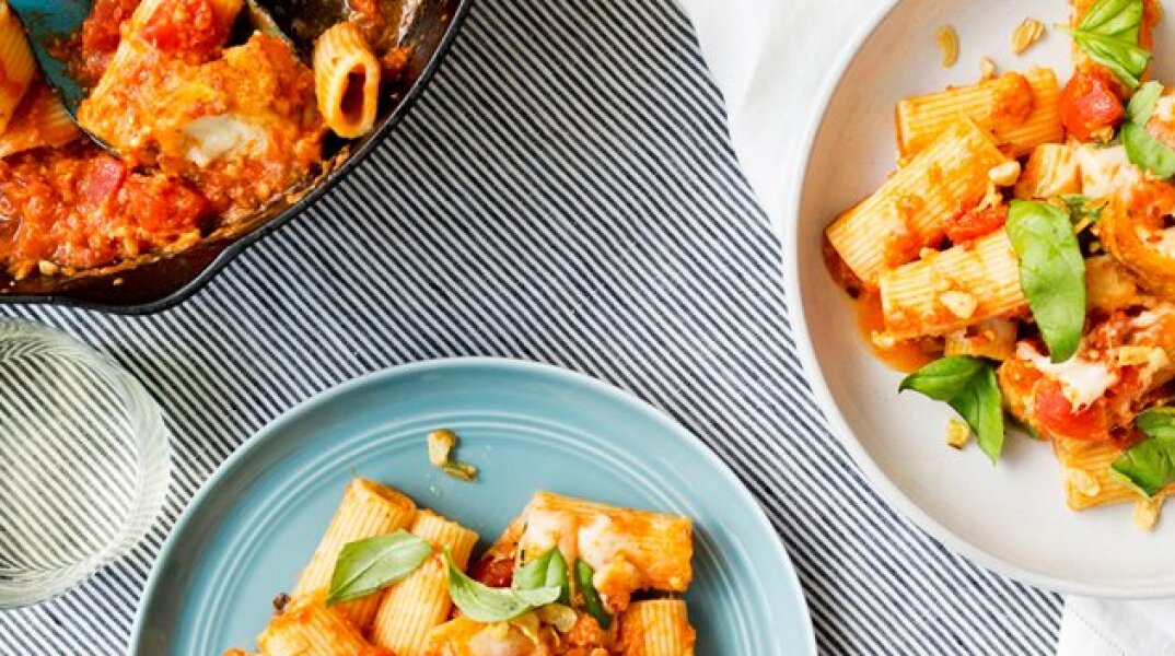 - Έπειτα ρίχνουμε μέσα στο τηγάνι τα ζυμαρικά, τη μαρινάρα και τη μισή παρμεζάνα.