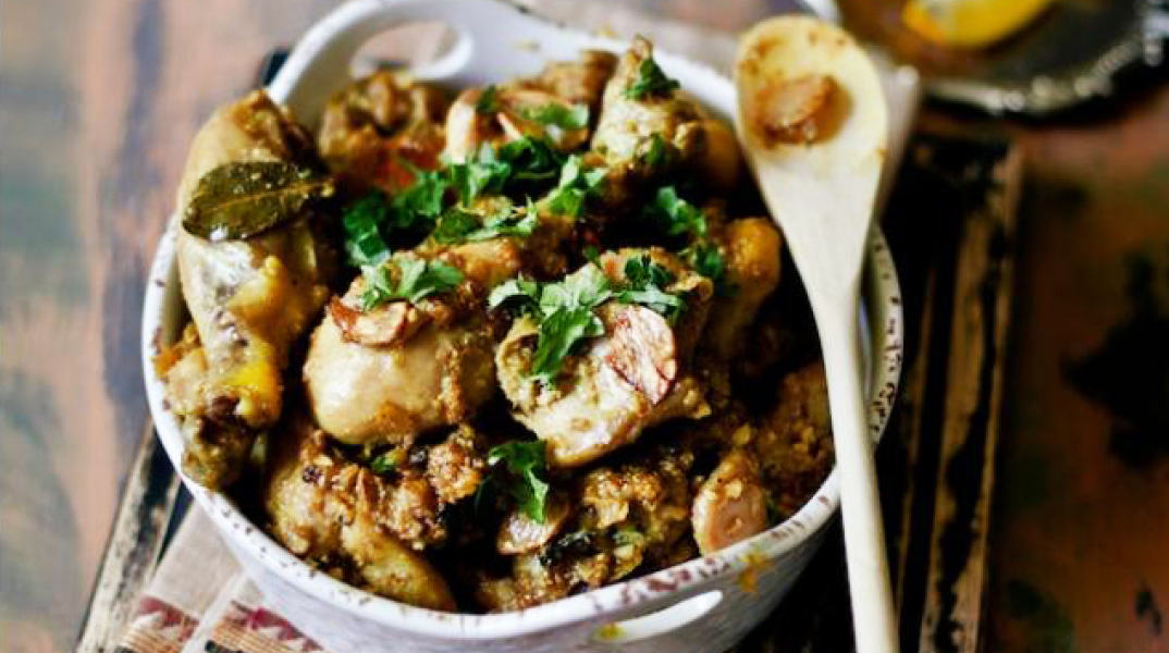 - Σε ένα wok ή σε ένα βαθύ τηγάνι, ζεσταίνουμε το ελαιόλαδο σε μέτρια ένταση. Προσθέτουμε την πιπεριά, τα φύλλα δάφνης και τις υπόλοιπες 4 σκελίδες σκόρδου (λιωμένες). Προσθέτουμε το κρεμμύδι και σοτάρουμε μέχρι να ροδίσει. Στο τέλος, προσθέτουμε το μαριναρισμένο κοτόπουλο και ανακατεύουμε, να ομογενοποιηθούν καλά όλα τα υλικά. Μαγειρεύουμε σε μέτρια φωτιά για περίπου 20 λεπτά, ανακατεύοντας περιστασιακά. Αν χρειάζεται, προσθέτουμε αλάτι.