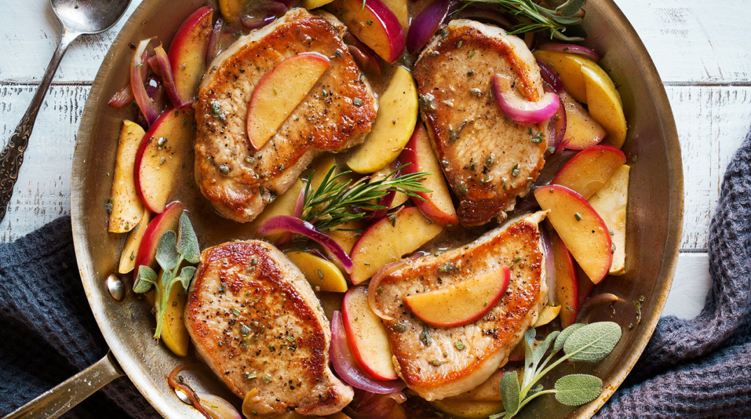 - Σερβίρουμε το χοιρινό με τα μήλα, στολισμένο με ένα κλαδί δενδρολίβανο, σε μια πιατέλα και δίπλα τη σάλτσα.