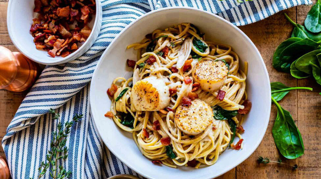 Σε αυτή τη συνταγή τα χτένια είναι που κάνουν όλη τη διαφορά, αλλά αν δεν είστε φαν του είδους μπορείτε να τα παραλείψετε και να συνεχίσετε με όλα τα υπόλοιπα. Γιατί είμαστε σίγουροι ότι κανείς δεν μπορεί να αντισταθεί σε μία πληθωρική μακαρονάδα με ζουμερή σάλτσα, μπέικον, σπανάκι και φρεσκοτριμμένη παρμεζάνα.