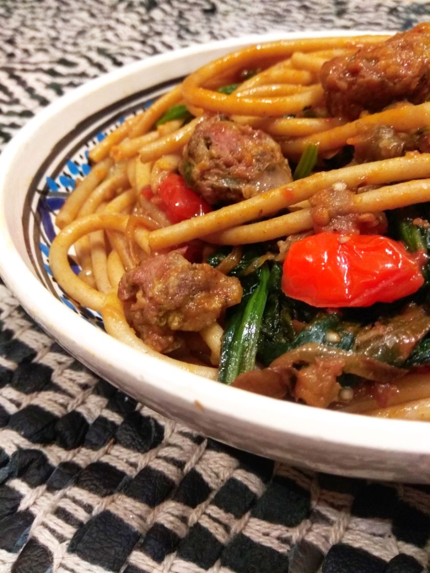 Δευτέρα και χρειαζόμαστε κάτι να μας ανεβάσει τη διάθεση. Τίποτα καλύτερο από ένα πιάτο αχνιστής μακαρονάδας, με λουκάνικα, σπανάκι και ντοματίνια. Θα το φτιάξεις γρήγορα, θα το απολαύσεις μέχρι την τελευταία του μπουκιά και θα ξεχάσεις -σχεδόν- τα πάντα…