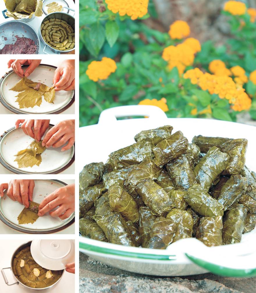 - Πλένουμε τα αμπελόφυλλα και τα ζεματάμε για λίγα λεπτά σε βραστό νερό. Τα στραγγίζουμε και τα αφήνουμε να κρυώσουν.