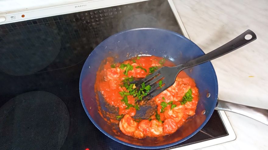 - Αφού ξεπαγώσουμε τα μύδια και τις γαρίδες, τα σοτάρουμε όλα μαζί σε χαμηλή φωτιά με ελάχιστο ελαιόλαδο.