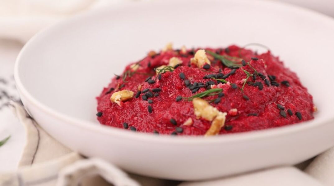 - Μόλις είναι έτοιμη, σερβίρουμε την αλιάδα παντζαριού με μαύρο σουσάμι και καρύδι.