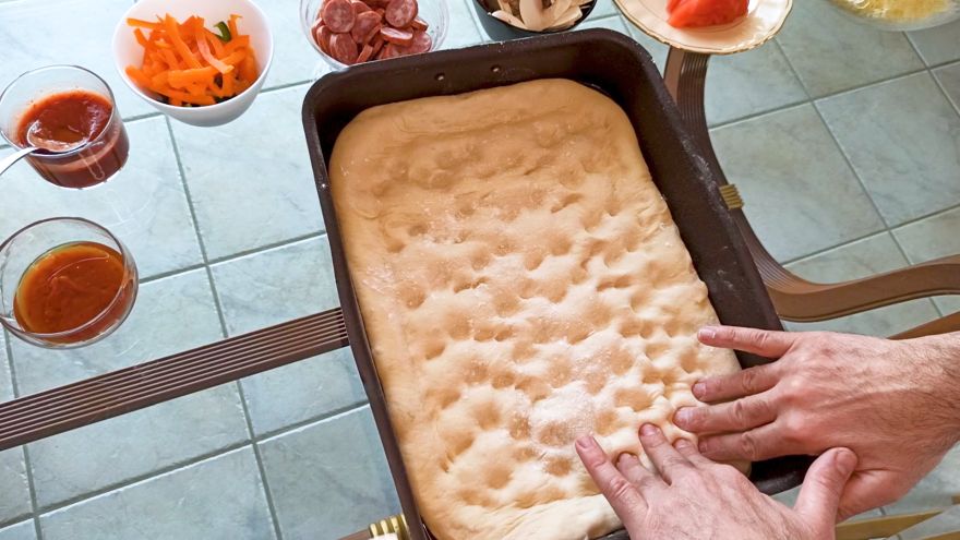 Η ζύμη μας θα είναι εξαιρετικά μαλακή τώρα και με τα δάχτυλά μας την τεντώνουμε ελαφρώς για να καλύψει ολόκληρη την επιφάνεια του τα ταψιού μας. Σκεπάζουμε με την πετσέτα για άλλα 40 λεπτά και αυτό είναι το τέταρτο και τελευταίο στάδιο ωρίμανσης της ζύμης.