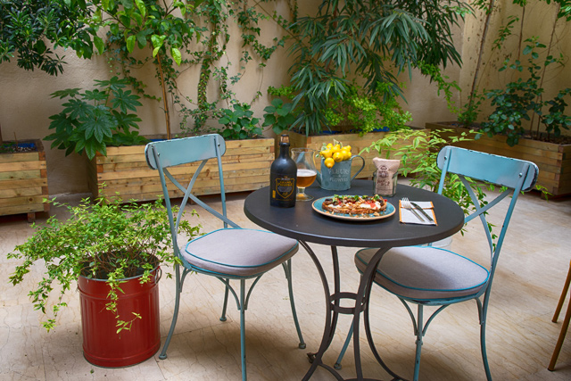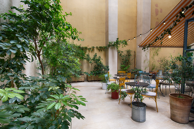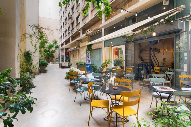 Την πρώτη φορά που το είδα διέσχιζα τη στοά σχεδόν τρέχοντας. Πρόλαβα να προσέξω όμως ότι σε εκείνη τη στοά κάτι δεν πήγαινε καλά. Είχα δει μια…αυλή; Επέστρεψα λοιπόν την επόμενη εβδομάδα και ναι, όντως δεν το είχα φανταστεί, υπήρχε μια αυλή! Μια αυλή με χρωματιστές καρέκλες, με φωτάκια και πράσινα φυτά, με ωραίες μουσικές να έρχονται από το εσωτερικό. Πραγματική όαση. Κάθομαι στα όμορφα τραπεζάκια, ικανοποιημένη με την ανακάλυψή μου και χαζεύω τον κατάλογο. Και εδώ έρχεται η αναπάντεχη ανακάλυψη Νο2 και ο λόγος που γράφω αυτό το κείμενο.
