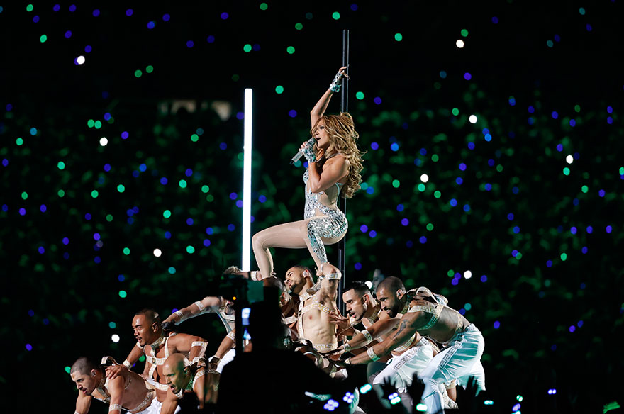 Σακίρα και Λόπεζ τα έδωσαν στην κυριολεξία όλα κι έβαλαν «φωτιά» στο Hard Rock Stadium για περισσότερα από 14 λεπτά. Η Σακίρα έπαιξε κιθάρα και ντραμς, ενώ όπως ήταν αναμενόμενο, λικνίστηκε όσο ποτέ στη ζωή της, αφού οι «hips don’t lie». Στη συνέχεια, η «Jennifer from the block» ανέβασε το κορμί της στον στύλο και τη θερμοκρασία στα ύψη, ενώ μοναδικό στιγμιότυπο ήταν όταν η κόρη της Emme Muñiz τραγούδησε με τη συνοδεία παιδικής χορωδίας «Born in the USA» με την 50χρονη λατίνα να μπαίνει φορώντας μια κάπα-σημαία των ΗΠΑ και του Πουέρτο Ρίκο.