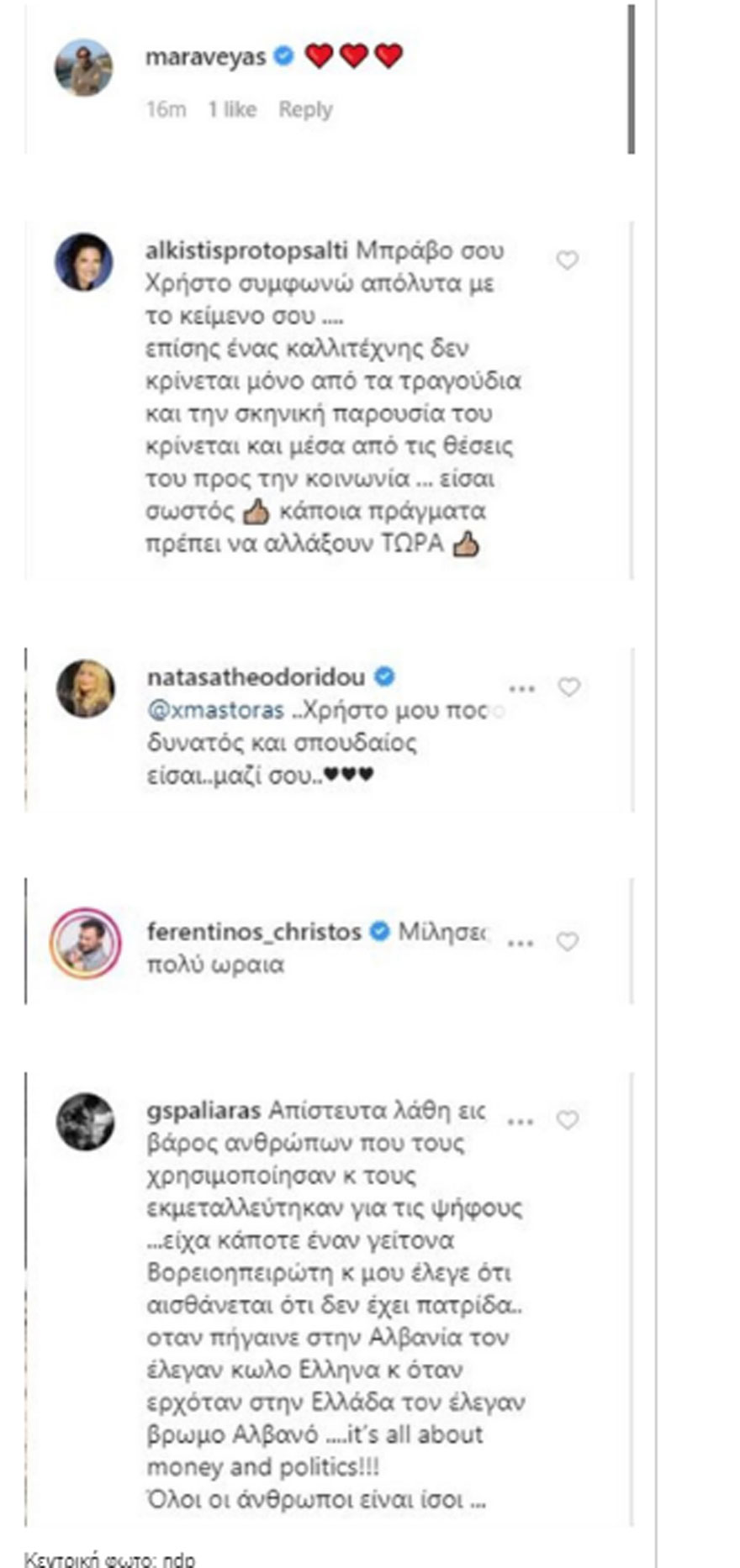 Στο ποστ του Μάστορα υπήρξαν πολλά μηνύματα συμπαράστασης, από απλούς διαδικτυακούς του φίλους, αλλά και από συναδέλφους του, όπως ο Κωστής Μαραβέγιας, η Άλκηστις Πρωτοψάλτη, ο Χρήστος Φερεντίνος.