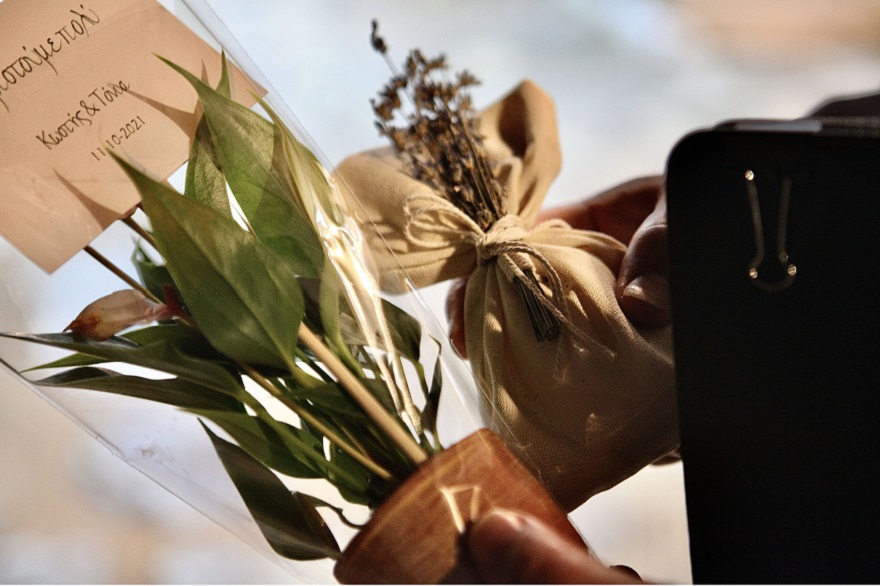 Tο ζευγάρι επέλεξε μια μπομπονιέρα-πουγκί, η οποία συνοδευόταν με ένα γλαστράκι που έγραφε: «Ευχαριστούμε πολύ, Κωστής & Τόνια, 11-10-2021».