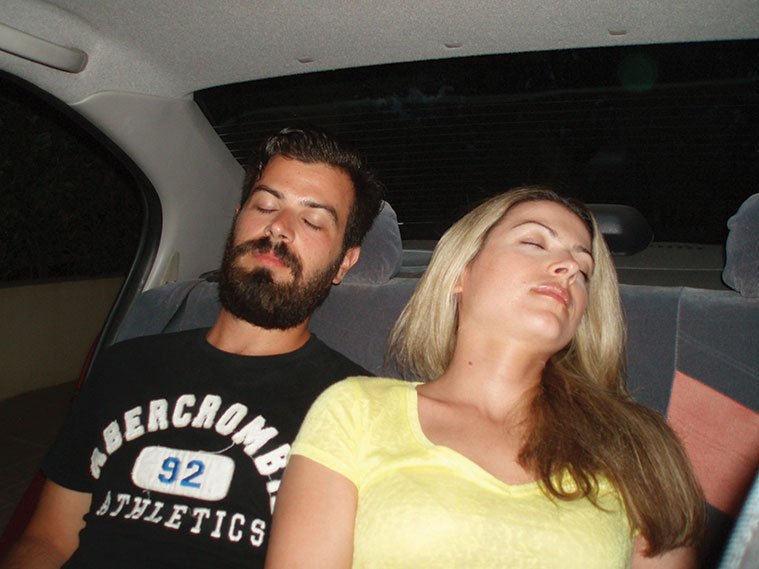 Τα αδέλφια Τζένη και Βασίλης Φανού, μέσα σε ένα Nissan Sunny, 2015.