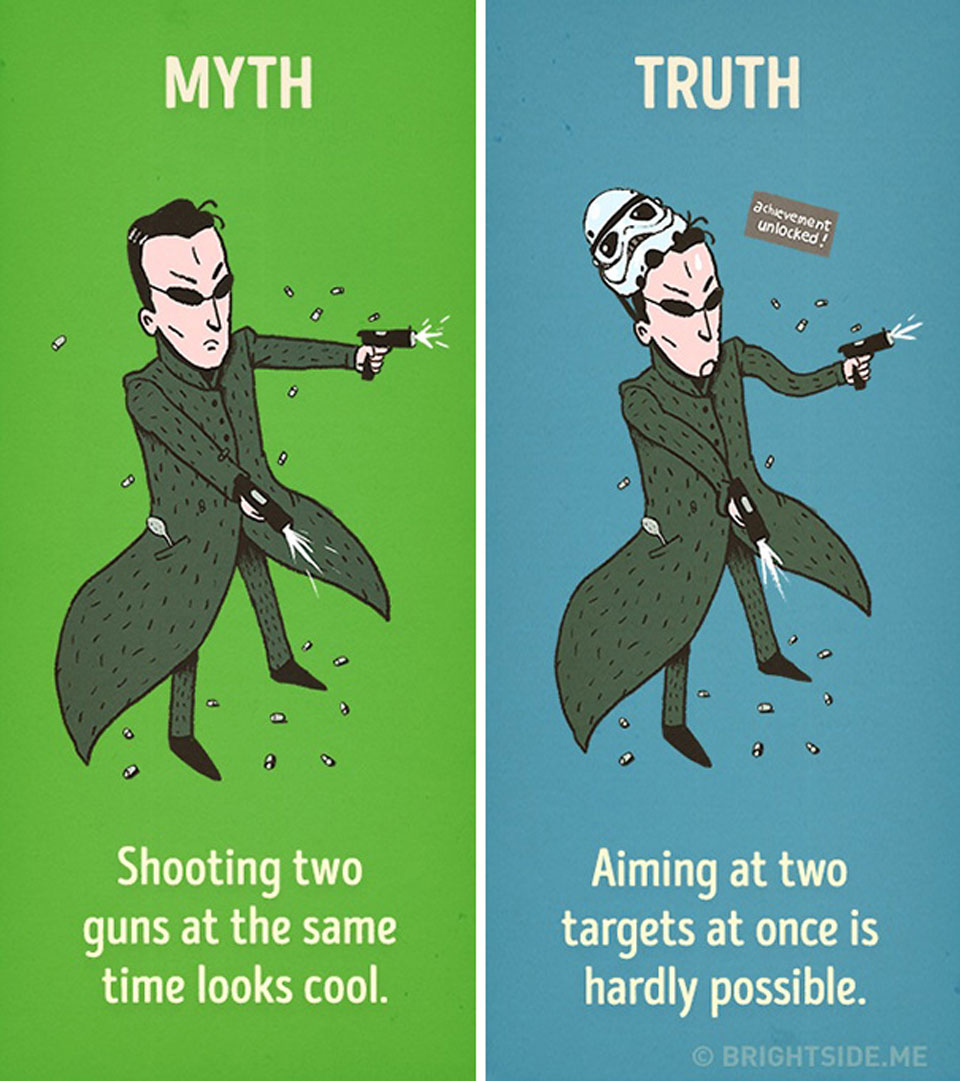 Μόλις χτες το βράδυ έβλεπα μια ταινία, το «Κάποτε στο Μεξικό» όπου ο κούκλος μεν τυφλός δε Τζόνι Ντεπ πυροβολεί τον εχθρό του από απόσταση 5 μέτρων κατευθείαν στην καρδιά. Χωρίς να βλέπει. Το τονίζω. Οκ, προφανώς είναι μια υπερβολή στην πλοκή της ιστορίας για να δείξει πόσο καλός πιστολέρο είναι και να ενισχύσει την εικόνα του «badass» διεφθαρμένου πράκτορα. Είναι μια σκηνή που θέλω να πιστεύω ότι εύκολα συνειδητοποιείς πώς οι πιθανότητες να συμβεί στην πραγματικότητα είναι μηδαμινές. Υπάρχουν όμως και άλλες φορές που πράγματα που μας εντυπωσιάζουν στις ταινίες/σειρές απέχουν πολύ από την πραγματικότητα. Δείτε μερικά πολύ αντιπροσωπευτικά παραδείγματα που εικονογράφησε το brightside.me παρακάτω και την επόμενη φορά που θα βρείτε κάτι φοβερά ενδιαφέρον σκεφτείτε το καλά πριν το «δοκιμάσετε στο σπίτι».