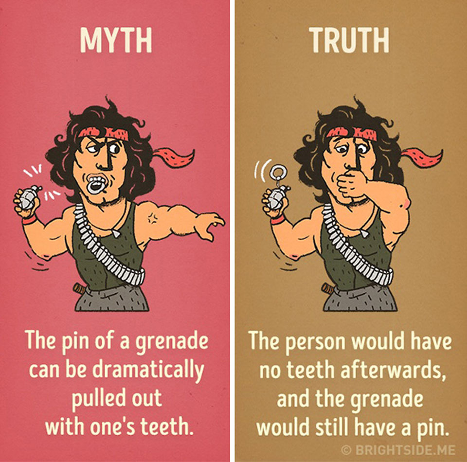 Όσο εντυπωσιακό κι αν φαίνεται, στην πραγματικότητα η περόνη της χειροβομβίδας δεν μπορεί να αφαιρεθεί με τα δόντια. Διότι τότε το άτομο και θα έμενε χωρίς δόντια και δεν θα είχε βγάλει την περόνη.